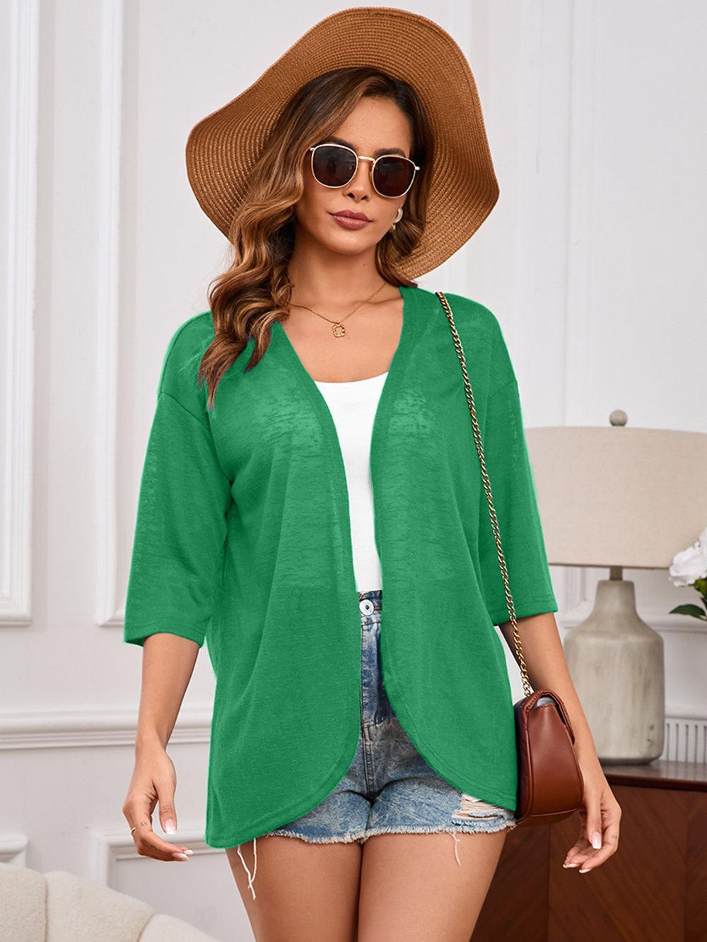 Demotime Womens Cardigan Lightweight Open Front 3/4 Sleeve Casual Soft Loose Fit Beach Cover Up Green
